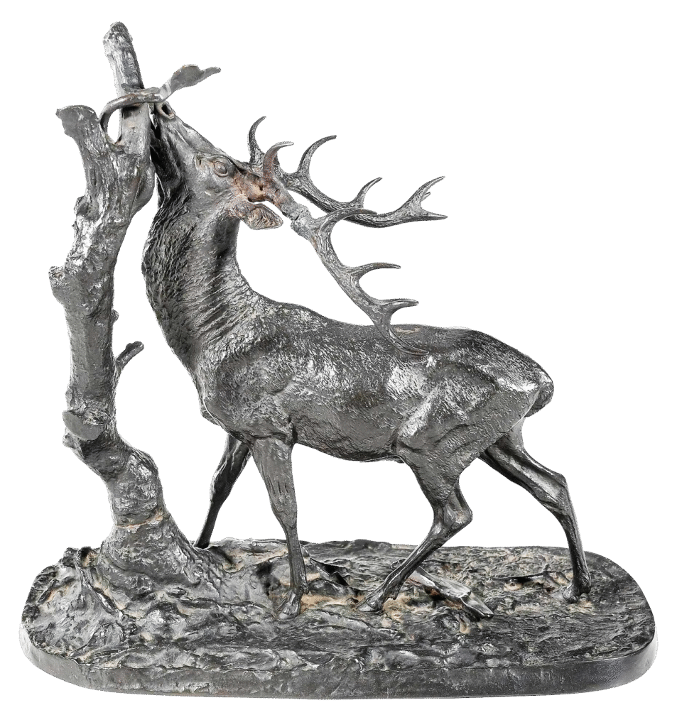 Pierre Jules Mêne, French (1810-1879) Bronze Sculpture, Stag Browsing. Signed to base. No. 118 Mene's catalog. Illustrated at page 107 "Les Animaliers", Jane Horswell. Good dark patina. Very good condition. Measures 14-1/2 inches tall.